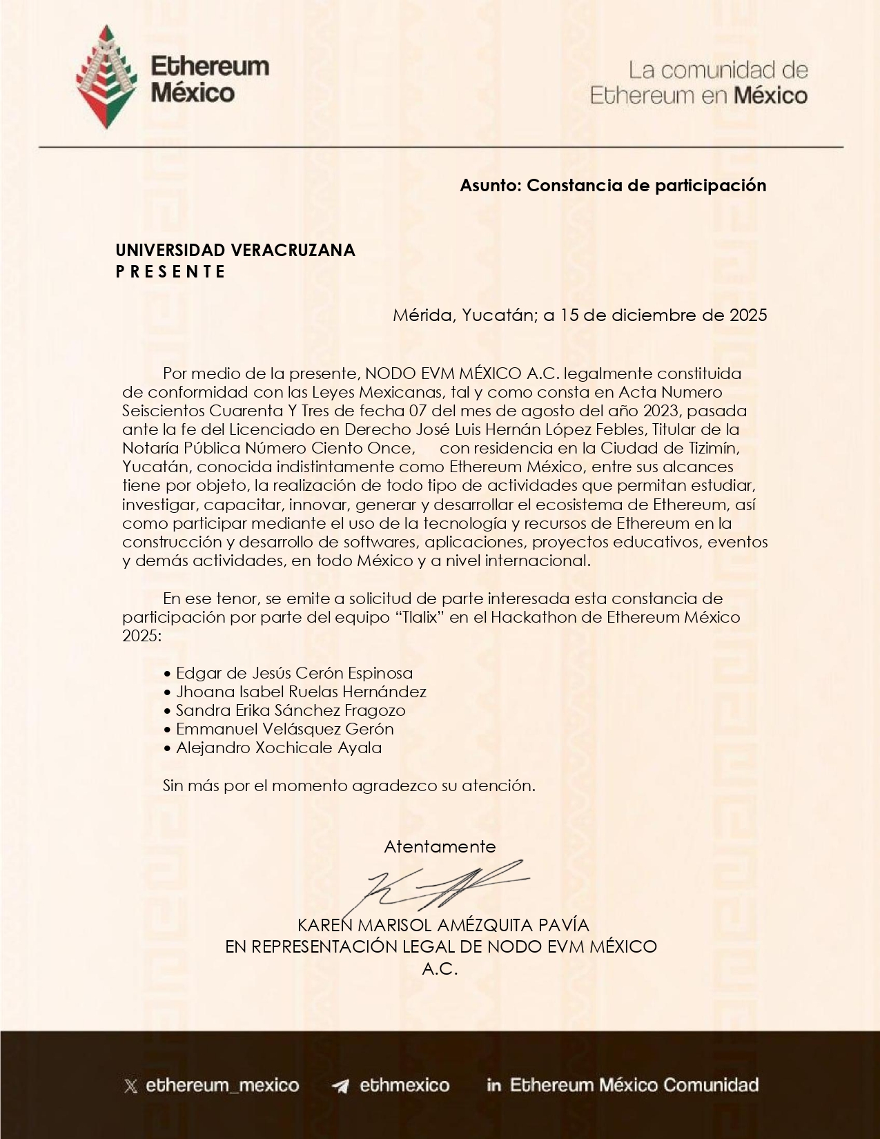 Constancia de participación de "Tlalix" en el Hackaton de ETH México 2025.